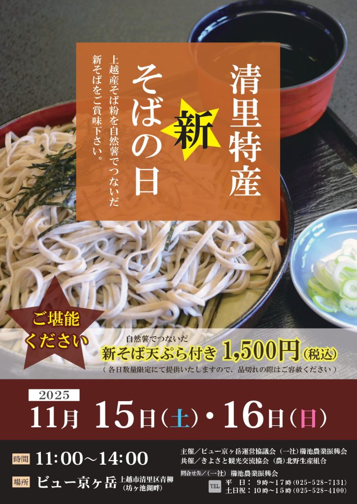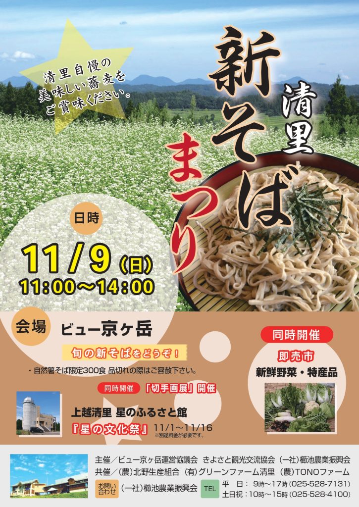 2025.10.07 新着情報 「清里 新そばまつり」開催「清里 新そばまつり」を11月9日(日)にビュー京ケ岳にて開催します。地元で採れた農産物の即売もあります。「清里特産 新そばの日」は11月15日・16日の開催になります。